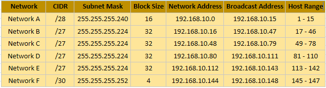 With this table, we can identify each subnet. Network A starts at 192.168.10.0 and ends with its broadcast address at 192.168.10.15. Network B starts at 192.168.10.16 and ends at its broadcast address at 192.168.10.47. Network C starts at 192.168.10.48 and ends at its broadcast address at 192.168.10.79…You get the picture. The new network will now look like this: